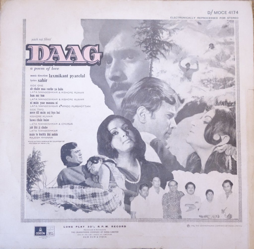 To start with YASH RAJ Films first ever film, producer and director Yash Chopra wanted to utilize the ‘best’ artists available then. Rajesh Khanna was in supreme form in the early seventies, he along with Sharmila Tagore, Rakhi were the stars of the film. LAXMIKANT-PYARELAL, in top gear, from 1967, got the honor of the first music director for ”YASH RAJ FILMS”. An outstanding/evergreen/ever-fresh music of ”Daag” is still popular.